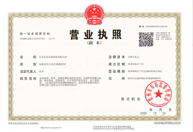 江蘇富冠金屬科技有限公司(以下簡稱:“公司”)成立于2018年4月,隸屬于鑫昌泰集團,是常州市經(jīng)開區(qū)招商引資的重點外資企業(yè),注冊資本1230萬美元,座落于常州市經(jīng)開區(qū)橫山橋智能裝備產(chǎn)業(yè)園,占地面積22762.8平方米,員工總數(shù)100人。公司主要經(jīng)營:金屬材料、模具、機械零部件的改性處理;金屬材料的激光處理;模具鋼材、機械零件、汽車零部件研發(fā)設(shè)計、加工及銷售。并具有真空淬火、普通淬火、調(diào)質(zhì)、去應(yīng)力回......
